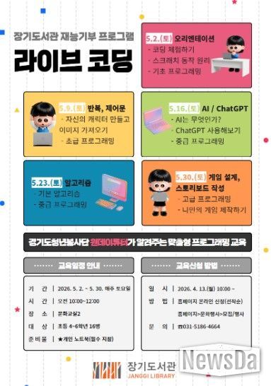 뉴스다 최광묵 기자 | 김포시 장기도서관은 재능기부 프로그램 ‘라이브 코딩’을 오는 5월 2일부터 5월 30일까지 매주 토요일 오전 10시에 장기도서관 문화교실2에서 운영한다고 밝혔다.