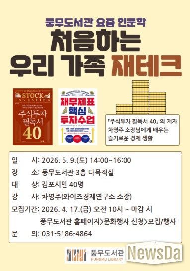 뉴스다 최광묵 기자 | 김포시 풍무도서관은 김포시민을 대상으로 ‘처음하는 우리 가족 재테크’를 오는 5월 9일 오후 2시부터 4시까지 운영한다.