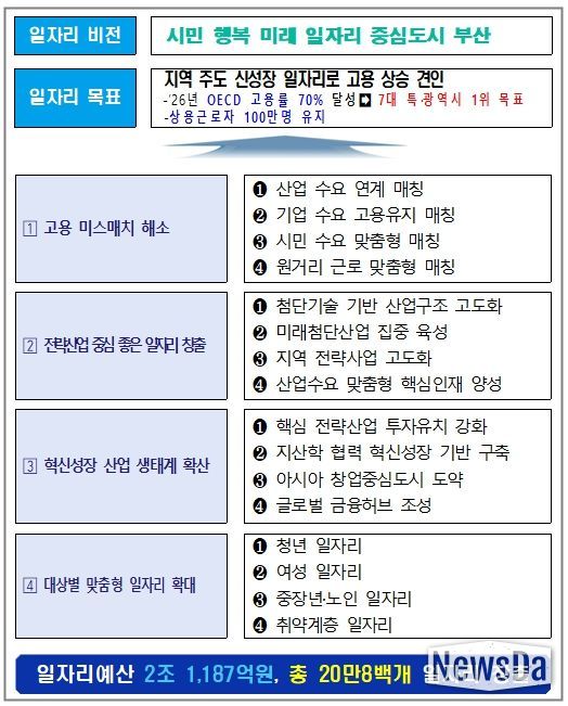 뉴스다 최광묵 기자 | 부산시는 '시민 행복 미래 일자리 중심도시 부산' 실현을 위한 '2026년 일자리정책 종합계획'을 수립하고 본격적인 추진에 나선다고 밝혔다.