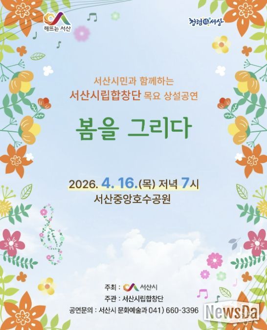 뉴스다 최광묵 기자 | 충남 서산시는 오는 4월 16일 오후 7시 중앙호수공원에서 서산시립합창단의 목요 상설공연이 개최된다고 밝혔다.