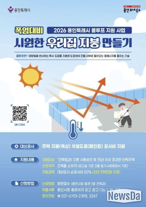 뉴스다 최광묵 기자 | 용인특례시는 여름철 폭염에 대응하고 에너지 절감을 위해 ‘2026 시원한 우리집 지붕만들기(쿨루프)’ 지원사업 대상자를 추가 모집한다고 13일 밝혔다.