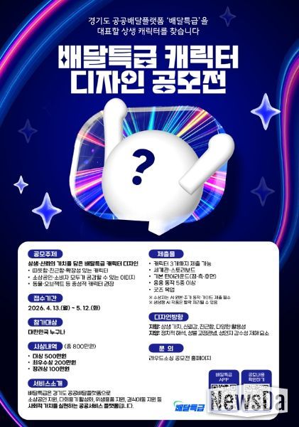 뉴스다 최광묵 기자 | 경기도주식회사가 오는 5월 12일까지 공공배달앱 배달특급의 캐릭터 디자인을 공개 모집한다.