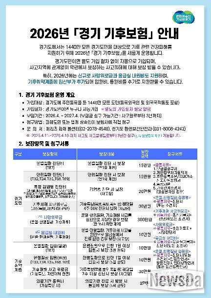 뉴스다 최광묵 기자 | 경기도가 진단비를 최대 두 배 인상하고, 사망위로금을 신설하는 등 보장 혜택을 대폭 강화한 ‘2026년 경기 기후보험’을 시작했다고 13일 밝혔다.