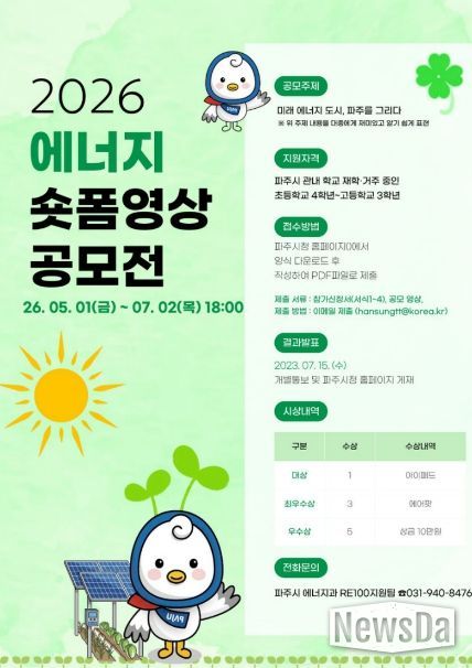뉴스다 최광묵 기자 | 파주시는 청소년들의 에너지 인식을 제고하고 디지털 미디어 활용 역량을 강화하기 위해 녪년 파주시 청소년 에너지 숏폼 영상 공모전’을 개최한다.