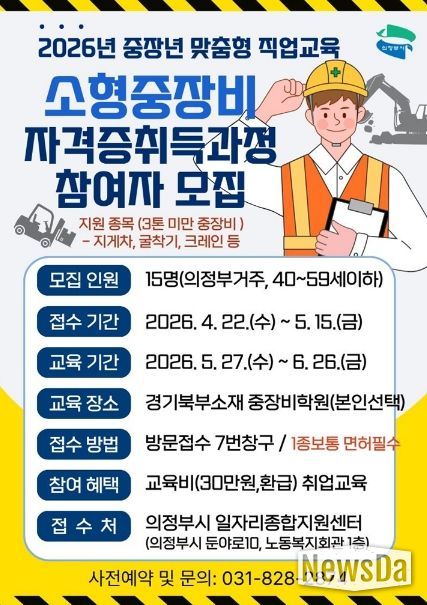 뉴스다 최광묵 기자 | 의정부시는 관내 중장년층 구직자의 재취업을 지원하기 위해 맞춤형 직업교육인 1인 1기술 ‘소형중장비 자격증 취득 과정’ 참여자를 모집한다.