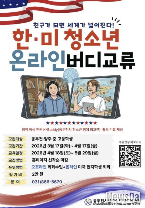 뉴스다 최광묵 기자 | 동두천시글로벌인재교육센터가 관내 청소년들의 글로벌 역량 강화와 실용 영어 소통 능력 향상을 위해 ‘중고등학생 한·미 청소년 온라인 버디(Buddy) 교류’ 프로그램 참가자를 모집한다고 밝혔다.