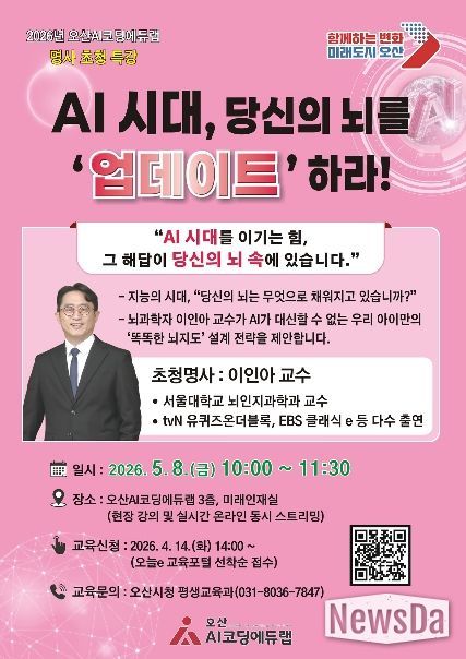 뉴스다 최광묵 기자 | 오산시는 오는 5월 8일 오전 10시 오산AI코딩에듀랩에서 『AI시대, 당신의 뇌를 ‘업데이트’하라!』를 주제로 명사 초청 디지털 AI 시민 특강을 개최한다고 밝혔다.