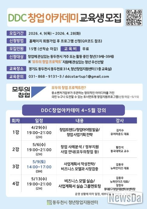 뉴스다 최광묵 기자 | 동두천시 청년창업지원센터는 지역 청년들의 창업 역량 강화와 성공적인 창업 지원을 위해 4월 9일부터 4월 28일까지 ‘DDC 창업아카데미’ 교육생을 모집한다.