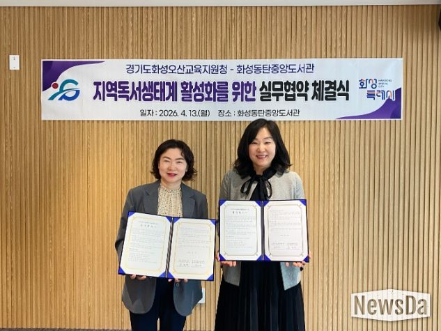 뉴스다 최광묵 기자 | 화성특례시 화성동탄중앙도서관은 화성오산교육지원청과 13일 화성동탄중앙도서관에서 독서문화진흥 및 상호 협력을 위한 실무협약을 체결했다.