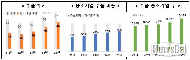 한편, 중소기업의 화장품 수출 규모는 2022년 44.7억 달러에서 2023년, 2024년에는 각각 53.2억달러, 68.5억 달러로, 그리고 2025년에는 83.2억 달러로 늘면서 매년 평균 23% 가까운 성장세를 이어오고 있다. 올해도 지난 2월까지의 수출액이 약 14억 달러로 이미 지난해 같은 기간의 수출액을 넘어서면서 이러한 흐름은 앞으로도 계속될 전망이다.