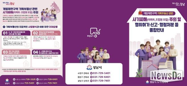 뉴스다 최광묵 기자 | 성남시는 최근 개발이 불가능하거나 제한적인 개발제한구역(그린벨트) 내 토지를 곧 해제될 것처럼 속여 고가에 판매하는 이른바 ‘기획부동산’ 사기가 증가함에 따라 시민 주의를 당부하고, 안내문을 제작·배부한다고 밝혔다.