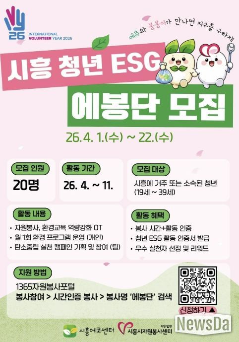 뉴스다 최광묵 기자 | 시흥시가 청년 주도의 환경 실천 확산과 ESG 가치 정착을 위해 ‘청년 ESG 에봉단’을 운영하는 가운데 1기 참여자 20명을 오는 4월 22일까지 모집한다.