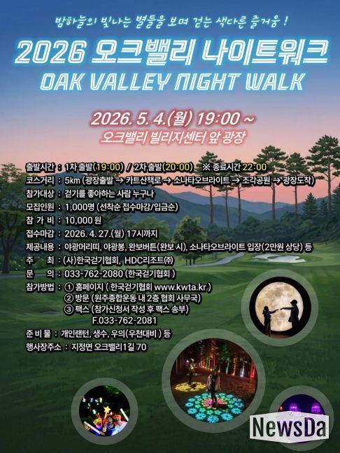 뉴스다 최광묵 기자 | 한국걷기협회와 아이파크리조트가 공동 주최하는 ‘2026 오크밸리 나이트 워크’가 다음 달 4일 원주에서 개최된다.