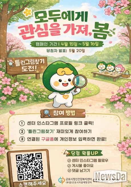 군포시정신건강복지센터 부설 군포시자살예방센터는 자살고위험시기를 맞아 시민 참여형 온라인 캠페인 “모두에게 관심을 가져, 봄”을 오는 4월 15일부터 5월 15일까지 운영한다고 밝혔다.