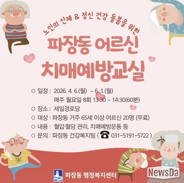 뉴스다 최광묵 기자 | 수원시 장안구 파장동은 관내 어르신들의 신체 및 정신건강 돌봄을 위해 ‘2026년 파장동 어르신 치매예방교실’을 장안구보건소 치매안심센터와 협업하여 운영한다고 밝혔다.