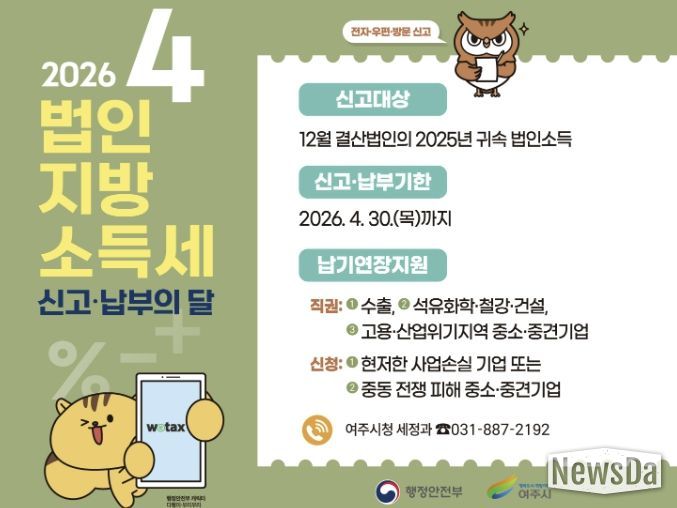 뉴스다 최광묵 기자 | 여주시는 2026년도 4월 한 달간 법인지방소득세 집중 신고·납부의 달을 운영한다.