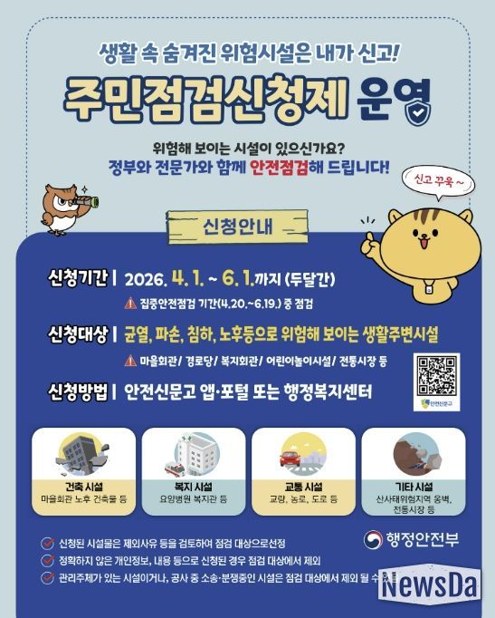 주민점검신청제는 안전 관리 사각지대 해소를 목적으로 시민이 생활 속 위험요인을 직접 발굴해 안전점검을 신청하면, 전문가와 담당 공무원이 합동으로 현장을 점검하고 그 결과를 안내하는 제도다.