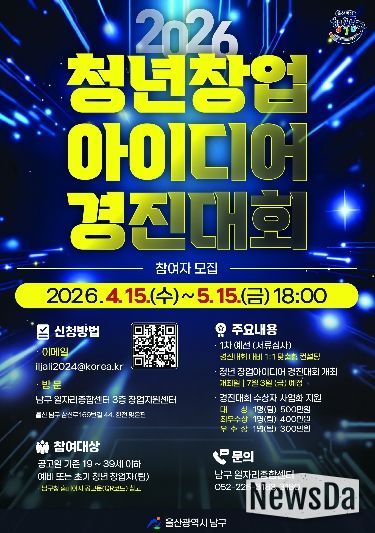 뉴스다 최광묵 기자 | 울산 남구는 혁신적인 아이디어로 창업 생태계를 활성화하고 청년 일자리를 창출하기 위해 ‘청년 창업아이디어 경진대회’ 공모전 참여자를 다음달 15일까지 모집한다고 15일 밝혔다.