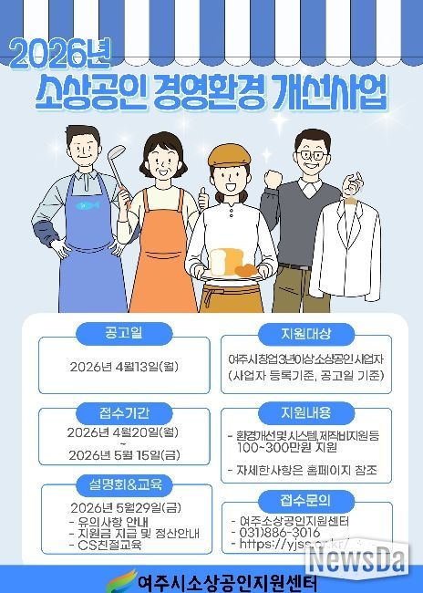 뉴스다 최광묵 기자 | 여주시소상공인지원센터는 여주시 소상공인의 경영환경 개선과 사업 경쟁력 강화를 위해 '2026년 소상공인 경영환경 개선사업'을 추진한다고 밝혔다.