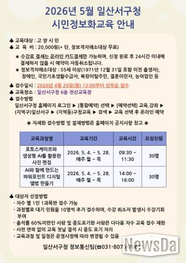 교육은 5월 4일부터 5월 28일까지 매주 월요일부터 목요일까지 진행되며, 과정별 30명을 모집한다. 교육 장소는 일산서구청 6층 전산교육장이다.