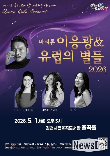 뉴스다 최광묵 기자 | 김천시 문화예술회관은 오는 5월 1일 오후 5시 율곡도서관 율곡홀에서 오페라 갈라 콘서트 '바리톤 이응광 & 유럽의 별들 2026'를 개최한다.