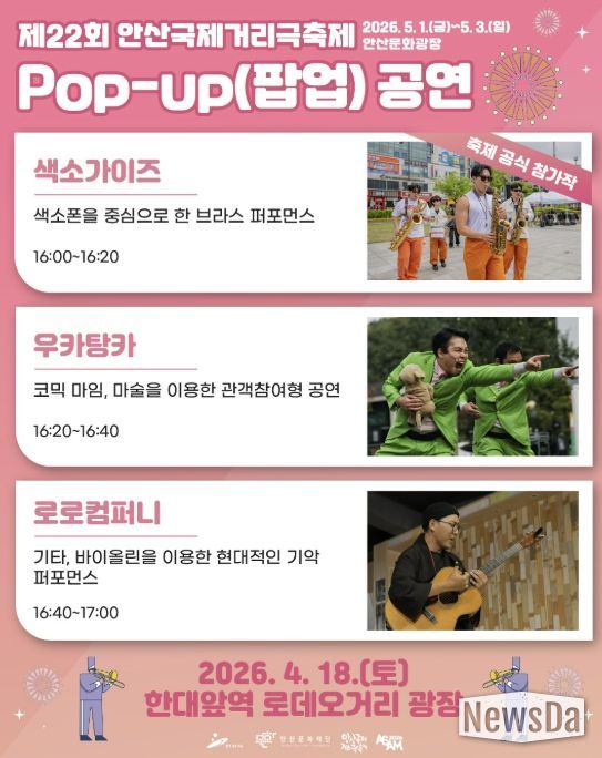 뉴스다 최광묵 기자 | 안산시와 안산문화재단은 ‘제22회 안산국제거리극축제’ 개막을 앞두고 오는 18일과 19일 양일간 한대앞역 로데오거리 광장과 선부광장에서 팝업(POP-UP) 공연을 개최한다고 16일 밝혔다.