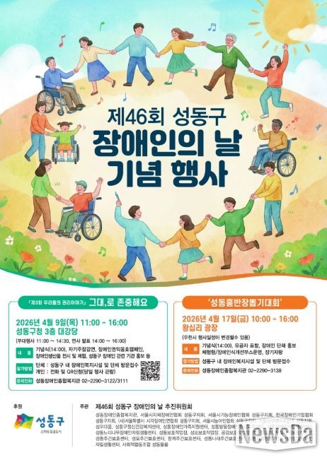뉴스다 최광묵 기자 | 서울 성동구는 제46회 장애인의 날을 맞아 오는 4월 17일 오전 10시부터 왕십리광장에서 장애인과 비장애인이 함께 어우러지는 다채로운 기념행사와 축제의 장을 개최한다고 밝혔다.