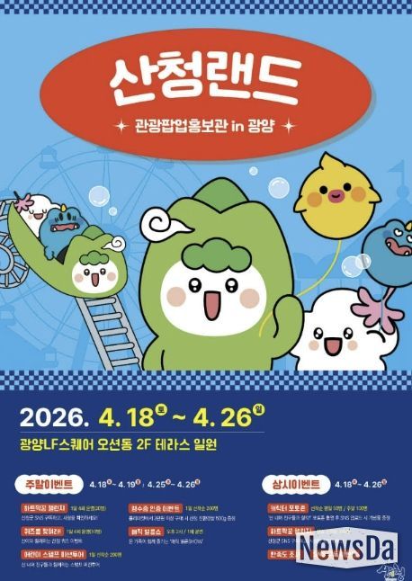 뉴스다 최광묵 기자 | 산청군은 오는 18일부터 26일까지 광양 LF스퀘어에서 ‘2026 산청관광 팝업홍보관 in 광양’을 운영한다고 16일 밝혔다.