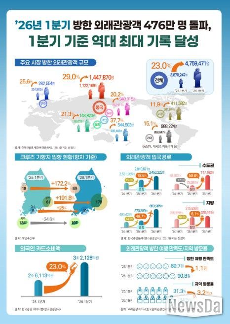 뉴스다 최광묵 기자 | 문화체육관광부는 올해 1분기(1~3월) 한국을 방문한 외국인 관광객이 약 476만 명을 기록하며, 3월 중동사태 발생에도 불구하고 1분기 기준 역대 최대 규모를 달성했다고 밝혔다. 이는 2025년 같은 기간 대비 23% 증가한 수치이며, 특히 3월에는 외래객 약 206만 명이 방한해 월별 기준으로도 최대 실적을 경신했다. ‘케이-컬처’의 세계적 인기와 더불어 민관의 적극적인 외래관광객 유치 노력이 결실을 본 것으로 분석된다.
