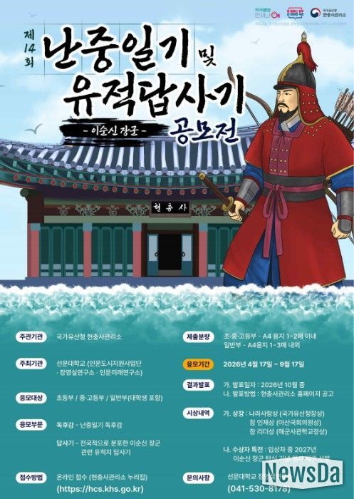뉴스다 최광묵 기자 | 국가유산청 현충사관리소는 선문대학교 인문도시지원사업단·장영실연구소·인문미래연구소와 함께 오는 4월 17일부터 9월 17일까지 이순신 장군 난중일기 독후감 및 유적답사기 공모전을 개최한다.