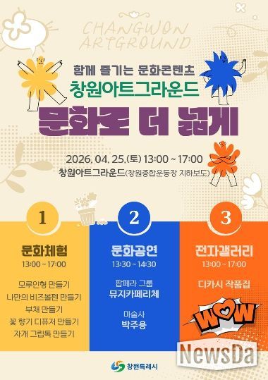 뉴스다 최광묵 기자 | 창원특례시는 완연한 봄을 맞아 시민 누구나 일상에서 다채로운문화예술을 즐길 수 있는 '창원아트그라운드, 문화로 더 넓게' 행사를 오는 4월 25일 토요일 창원종합운동장 지하보도에서 개최한다고 밝혔다.