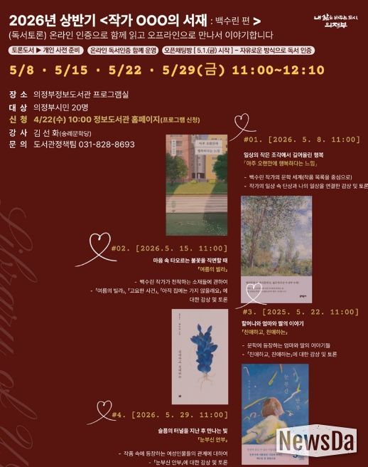 뉴스다 최광묵 기자 | 의정부시는 2026년 상반기 ‘작가 OOO의 서재: 백수린 편’을 5월 매주 금요일(8일, 15일, 22일, 29일) 총 4회에 걸쳐 의정부정보도서관에서 운영한다.
