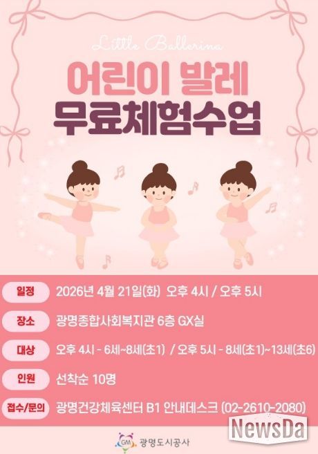 운영 프로그램은 K-POP 댄스와 어린이 발레 2개 종목으로 구성된다. 상세 일정은 ▲어린이 발레 4월 21일 ▲K-POP 댄스 4월 22일이며, 광명종합사회복지관 6층 GX실에서 진행될 예정이다.