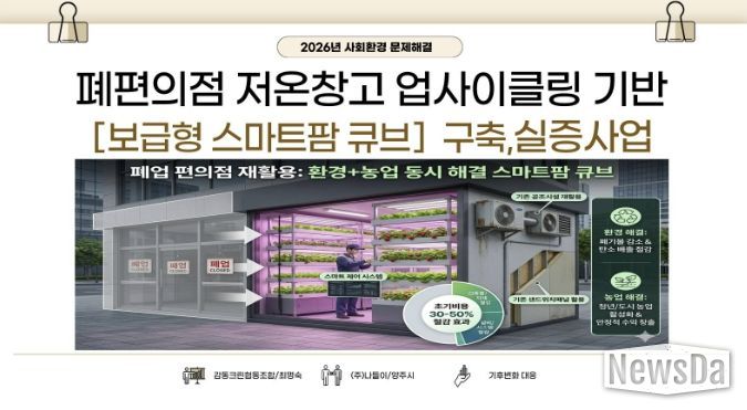 선정된 사업은 ‘폐편의점 저온창고 업사이클링 기반 보급형 스마트팜 큐브 구축·실증사업’이다. 폐기되는 냉장·공조설비를 재활용해 스마트팜 구축비용을 30~50% 절감하고, 이를 스마트팜 인프라로 전환하는 순환경제 모델로 사업비 3천만 원을 지원받게 된다.