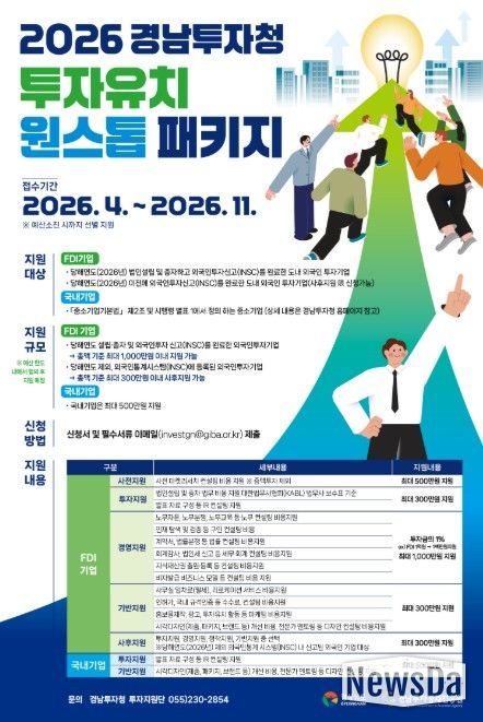 뉴스다 최광묵 기자 | 경남투자경제진흥원 경남투자청은 도내 투자기업의 안정적인 정착과 성장을 지원하기 위해 ‘2026년 투자유치 원스톱 패키지 서비스’를 추진한다고 밝혔다.