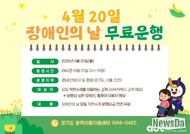 시 관계자는 “장애인의 날을 맞아 준비한 이번 무료 운행이 이동에 제약을 받는 분들에게 작은 응원이 되길 바란다”며, “앞으로도 교통 약자가 안전하고 편리하게 이동할 수 있도록 안정적인 서비스 제공에 최선을 다하겠다”고 말했다.