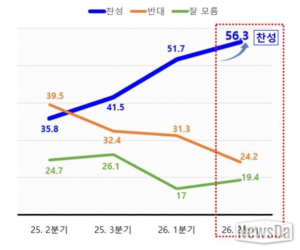 수원 군공항 이전에 대한 화성시민 찬성 비율은 꾸준히 상승하고 있다. 언론사 여론조사 결과에 따르면 ‘찬성’ 비율은 2025년 6월 35.8%, 9월 41.5%, 2026년 1월 51.7%, 4월 56.3%였다. 이번 조사에서는 찬성, 반대 격차가 32.1%까지 벌어졌다.