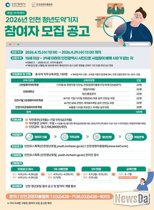 뉴스다 최광묵 기자 | 인천광역시는 청년의 취업역량을 강화하고 지역기업이 필요로 하는 실무형 인재를 양성하기 위해 ‘2026 인천 청년도약기지’ 사업 참여자 130명을 4월 15일부터 4월 29일까지 모집한다고 밝혔다.
