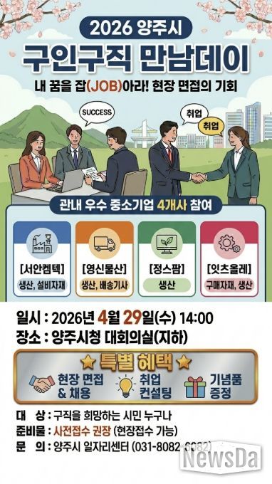 행사는 오는 4월 29일 오후 2시부터 4시까지 양주시청 대회의실에서 진행되며, 구직자는 사전 신청 또는 행사 당일 오후 1시 30분부터 현장 접수 후 면접에 참여할 수 있다. 참여를 희망하는 구직자는 이력서 등 지원 서류를 지참해야 한다.