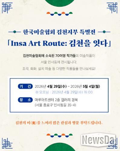 뉴스다 최광묵 기자 | 김천시는 4월 29일부터 5월 4일까지 6일간 서울 마루아트센터 2층 갤러리 경북에서 한국미술협회 김천지부 특별전 ‘인사 아트 루트(Insa Art Route): 김천을 잇다’를 개최한다고 밝혔다.