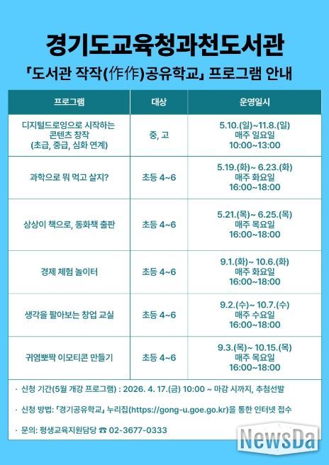 조중복 경기도교육청과천도서관장은 “작작(作作) 공유학교는 독서를 기반으로 학생들이 스스로 생각하고 표현하는 경험을 통해 미래 역량을 키우는 프로그램”이라며 “앞으로도 학교와 지역을 연계한 다양한 교육 프로그램을 통해 학생 중심의 배움 환경을 지속적으로 확대해 나가겠다”고 말했다.