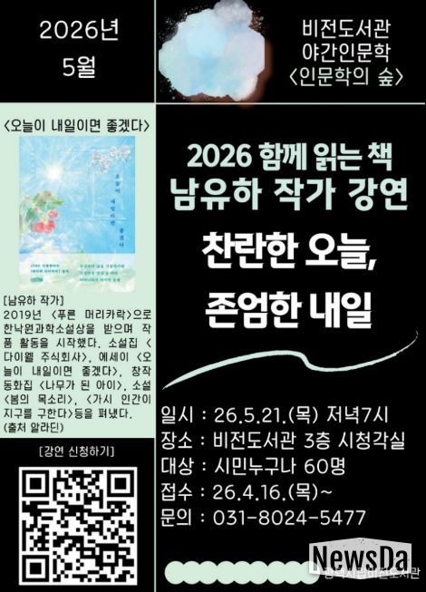 뉴스다 최광묵 기자 | 평택시립 비전도서관은 오는 5월 21일 저녁 7시 남유하 작가를 초청하여 ‘찬란한 오늘, 존엄한 내일’을 주제로 야간 인문학 강연을 진행한다.