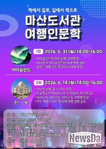 뉴스다 최광묵 기자 | 김포시 마산도서관이 오는 5월 31일과 6월 14일 오후 2시부터 4시까지 다목적실에서 여행 인문학 강연 ‘책에서 길로, 길에서 책으로’를 운영한다.