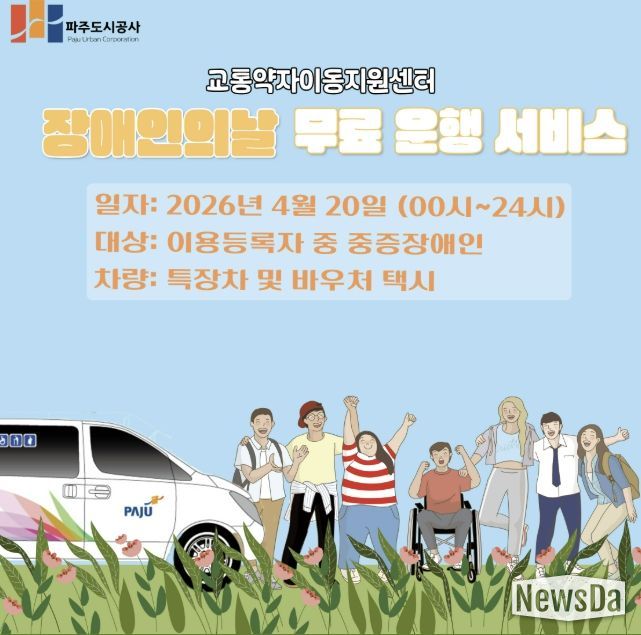 뉴스다 최광묵 기자 | 파주도시공사 교통약자이동지원센터에서는 오는 4월 20일 장애인의 날을 맞아 교통약자를 위한 무료 운행 서비스를 실시한다.