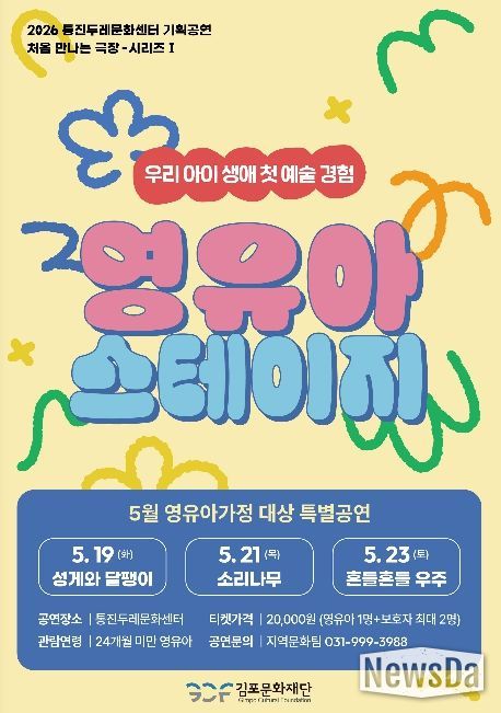 뉴스다 최광묵 기자 | 김포문화재단은 오는 5월 가정의 달을 맞아 통진두레문화센터 특별 기획으로 24개월 미만 영유아를 위한 체험형 공연 시리즈 '처음 만나는 극장 - 영유아 스테이지'를 선보인다.