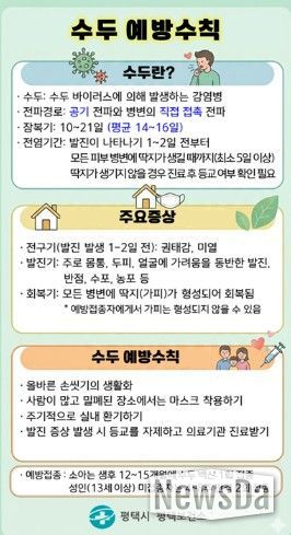 뉴스다 최광묵 기자 | 평택시는 최근 전국적으로 수두 환자가 증가하는 가운데, 관내에서도 수두 신고가 지속됨에 따라 집단시설 및 가정 내 예방수칙 준수를 당부했다.