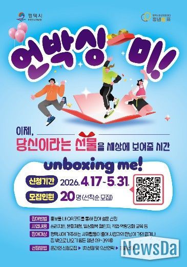 뉴스다 최광묵 기자 | 평택시 청년지원센터는 4월 17일부터 5월 31일까지 평택시에 거주하는 사회활동이 줄어 사람과의 만남이 거의 없거나 집 밖으로 나오기 힘든 청년의 일상 회복과 사회 참여 촉진을 위해 실시하는 지원사업 '언박싱 미!' 참여자를 모집한다.