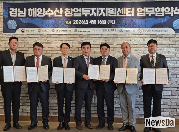 뉴스다 최광묵 기자 | 경상국립대학교 해양과학대학은 경상남도 해양수산 창업투자 활성화를 위해 4월 16일 경남테크노파그에서 경상남도, 경남테크노파크, 경남항노화연구원, 수협중앙회 경남본부, 경상남도 청년어업인연합회 등과 업무협약(MOU)을 체결했다.