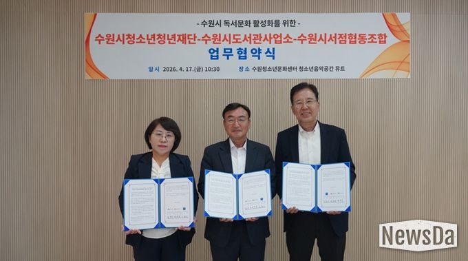뉴스다 최광묵 기자 | 수원시청소년청년재단은 수원시도서관사업소, 수원시서점협동조합과 4월 17일 수원청소년문화센터에서 수원시 독서문화 활성화를 위한 업무협약을 체결했다.