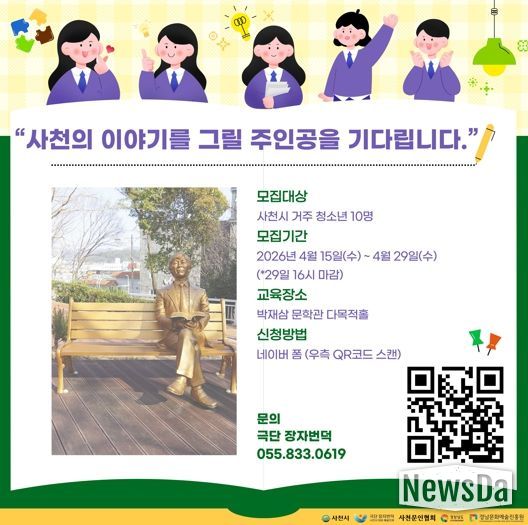 뉴스다 최광묵 기자 | 사천시, 사천문인협회, 극단 장자번덕은 4월 29일까지 지역 청소년을 대상으로 문화예술교육 '내 마음의 삼천포, 박재삼을 그리다'의 참가자를 모집한다고 19일 밝혔다.